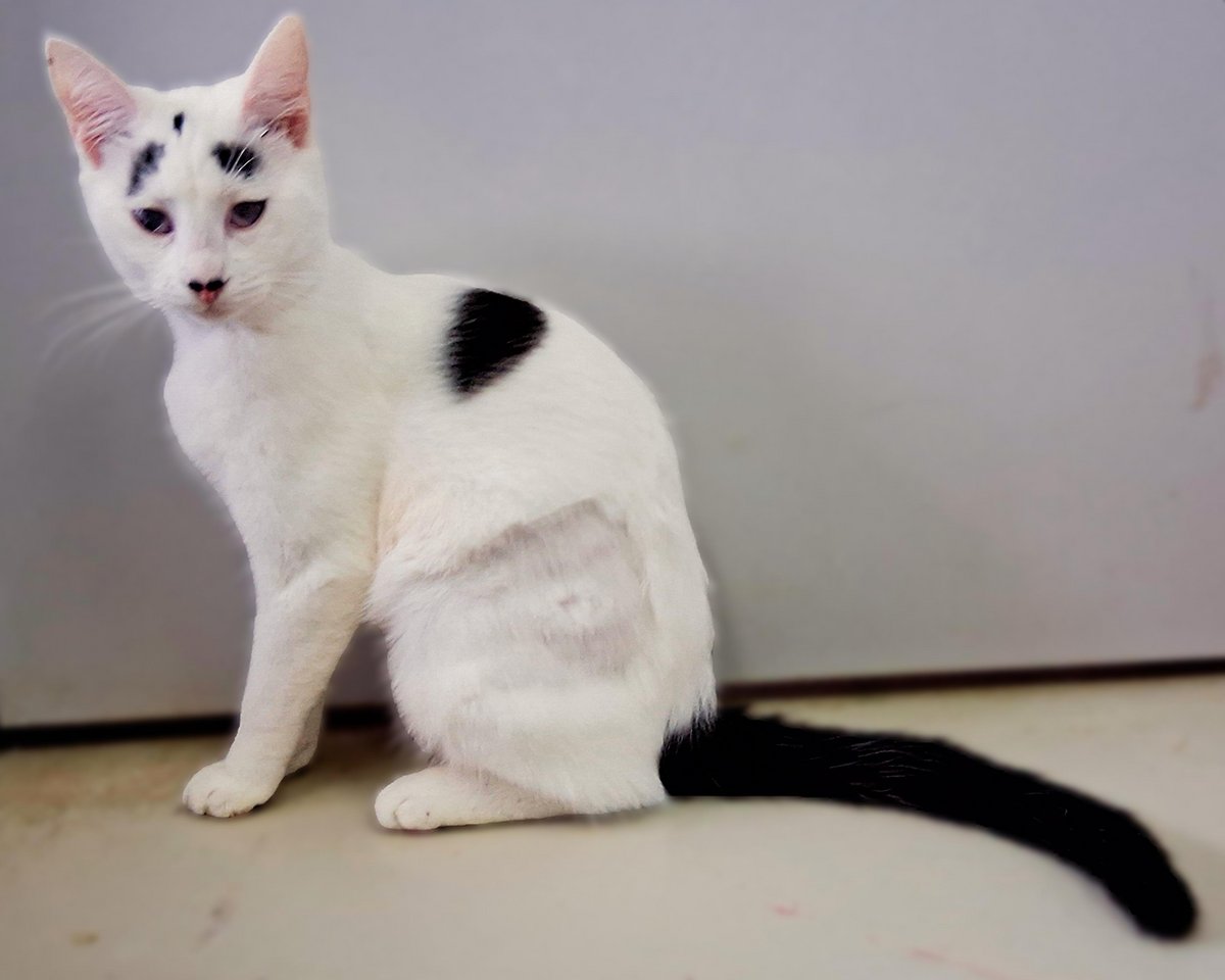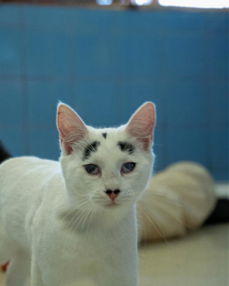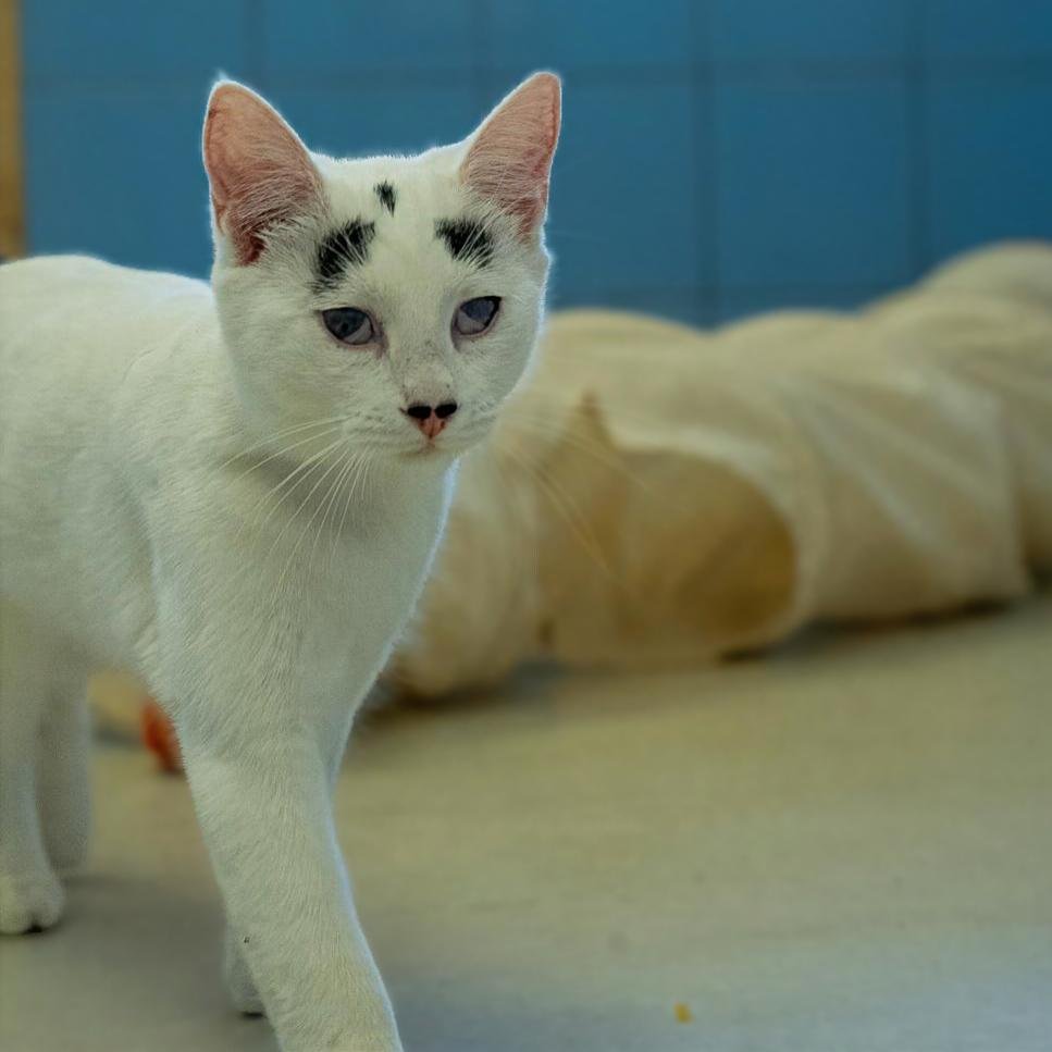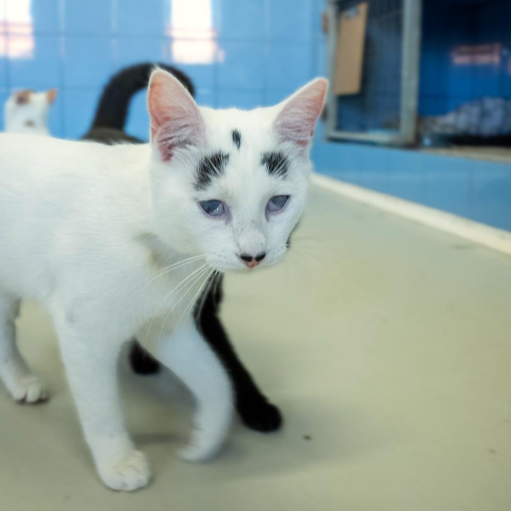 Η Μάφιν έχει πλάκα! Βασικά, κοιτάξτε τα σχέδια που έχουν σχηματιστεί στο κορμάκι της με μαύρο χρώμα, πάνω στην κατά τα άλλα κατάλευκη γούνα της. Κοιτάξτε την κατάμαυρη ουρά της, που είναι σαν να τη βούτηξε σε μπογιά. Κοιτάξτε τις πιτσιλιές πάνω από τη μύτη της, που μοιάζουν με το μουστάκι του Σαρλό. Κοιτάξτε τις μουτζούρες που μοιάζουν με φρύδια και της δίνουν μια μοναδική έκφραση. Τη Μάφιν δεν πρόκειται να την μπερδέψετε ποτέ με άλλη γάτα. Ήρθε μαζί με την αδερφή της τη Σου όταν ήταν ενός μηνός. Η Σου είχε σοβαρό πρόβλημα στα μάτια της και αναγκαστήκαμε να της τα αφαιρέσουμε, όμως η Μάφιν δεν ήταν σε τόσο κακή κατάσταση. Βέβαια, έχει αρκετά μειωμένη όραση – μάλλον βλέπει σκιές και αντιλαμβάνεται τη φωτεινότητα, όμως αυτό δε θα το είχαμε καταλάβει αν δεν μας το είχε πει ο κτηνίατρος. Η Μάφιν είναι ένα γατάκι μέσα στη χαρά. Σκαρφαλώνει πάνω σου, διεκδικώντας αγκαλιές και παιχνίδια. Θέλει επαφή, θέλει δραστηριότητα, θέλει χάδια. Αλλά κυρίως θέλει μια οικογένεια να τη δεχτεί, να την αγαπήσει και να την κάνει μέλος της. Το Μαφινάκι μας είναι ένα ξεχωριστό πλάσμα που του αξίζει να ζήσει ευτυχισμένο.