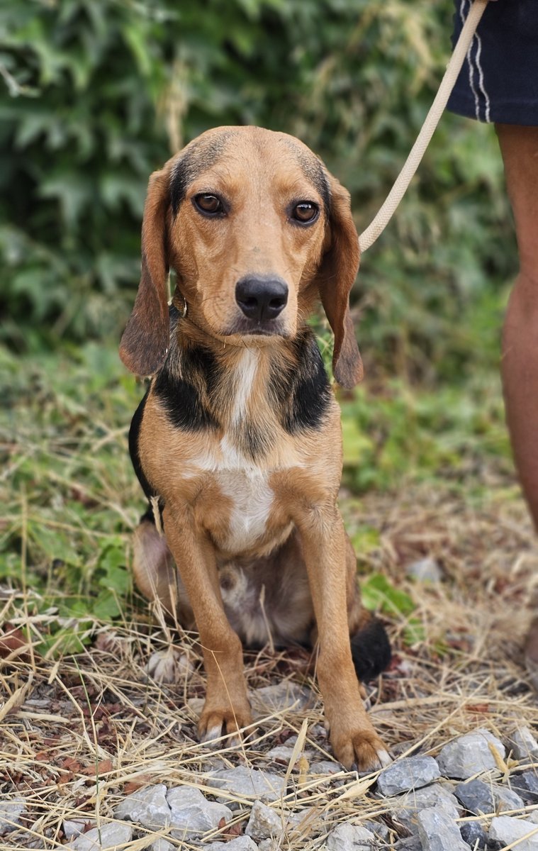 It is a very special dog in appearance, because it looks exactly like a hound, from the classic, the Greek, the black brown, its ears are the size it should, but its body is not!