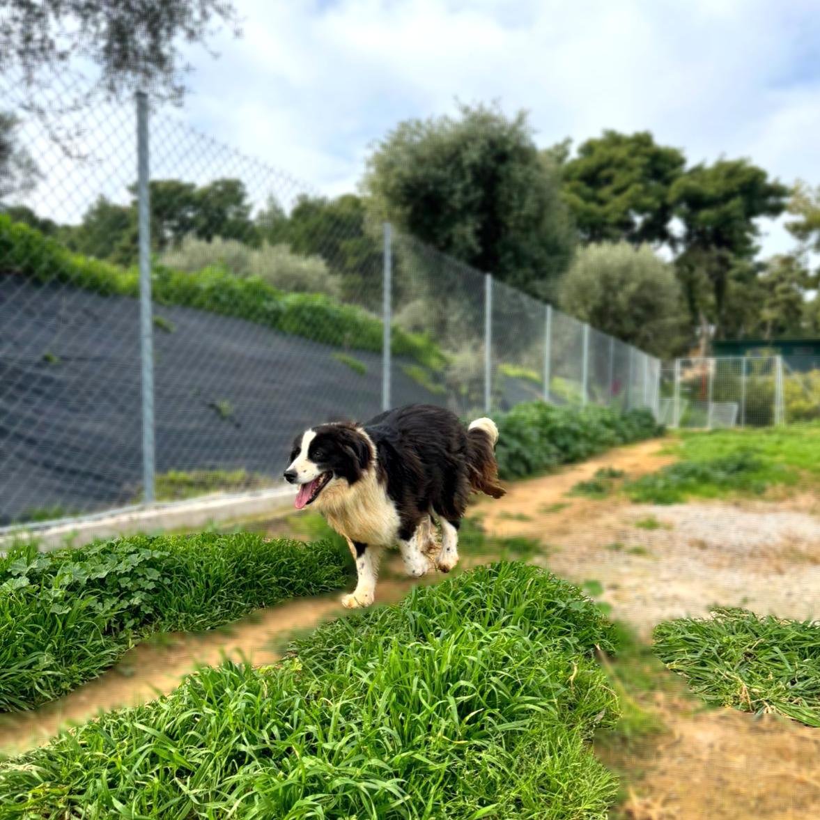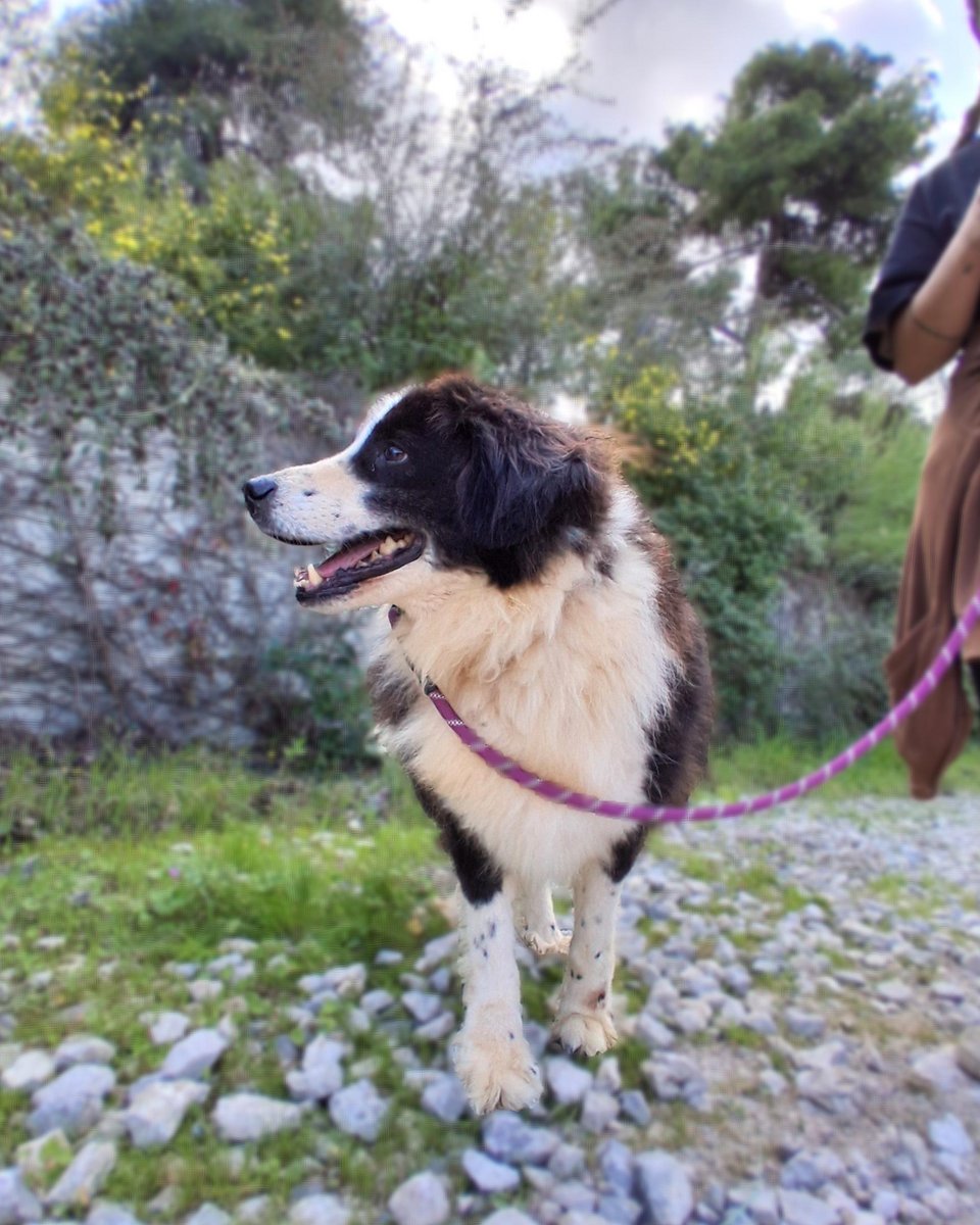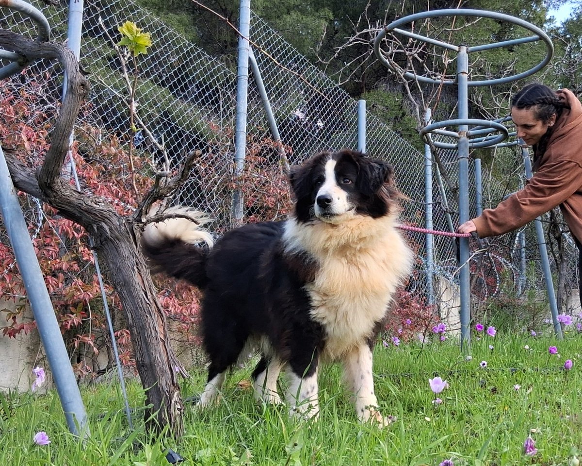 We do not know where or how Tío lived before he ended up tied up at the municipal shelter in Krestena. We imagine he must have lingered near a taverna, with unlimited access to leftovers. When he arrived to us, he was overweight and, mostly because of his age, that extra weight is not kind to him. With a careful diet and gentle exercise, he will return to a healthy weight and become even more playful and spirited. He is good with other dogs and exceptionally good with people. He has tremendous patience, and he proved it to us when, even though he did not enjoy it, he stood still while we cut away the heavy, matted clumps hanging from his chest and hips and trimmed his large nails.